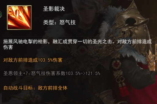 超怒气技:施展风驰电掣的枪影,融汇成贯穿一切的圣光之击。对敌方前排造成103.5%/121.5%伤害。