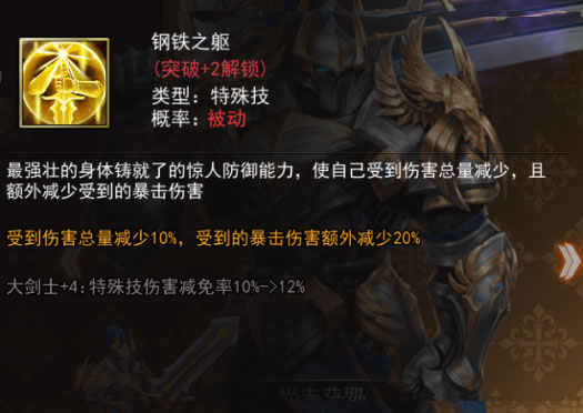 特殊技:最强壮身体铸就了的惊人防御能力,收到的伤害总量减少,收到的暴击伤害额外减少一定数额。