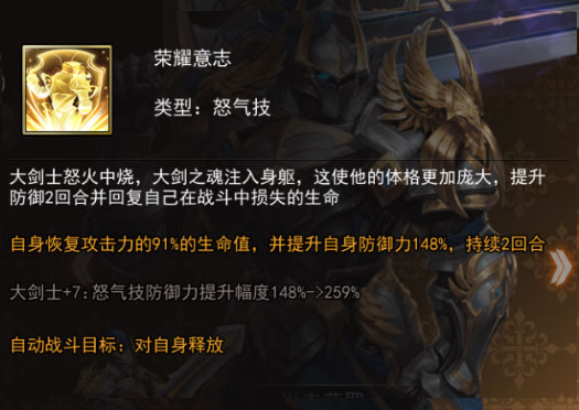 怒气技:大剑士怒火中烧,大剑之魂注入身躯,这使它的体格更加庞大,回复自身生命值,并提高自身防御力,持续两回合。