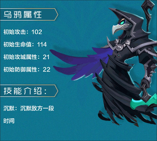 既然是解析角色,那首当其冲的就是看它的属性了,因为是辅助类型的角色,在攻击力方面就属于中规中矩的情况,但攻城属性21也算很高的了,除了攻城属性之外,还有相对其他辅助来说更高的防御属性和生命值,辅助最需要的2种属性乌鸦的数值都还很不错,我说这这个角色到现在看是T0大家没问题吧。然后我们再看角色的技能:沉默敌方一段时间,沉默作为除了眩晕等强制控制之外最实用的控制技能,是可以帮助扭转游戏战局的,例如敌方在释放技能的前摇时间,乌鸦给与他一个沉默,敌方当场傻眼,等沉默结束,发现自己释放的技能没有任何效果,不仅如此角色还要重新等待技能,非常的搞人心态,可以作为一个非常实用的反制手段使用。