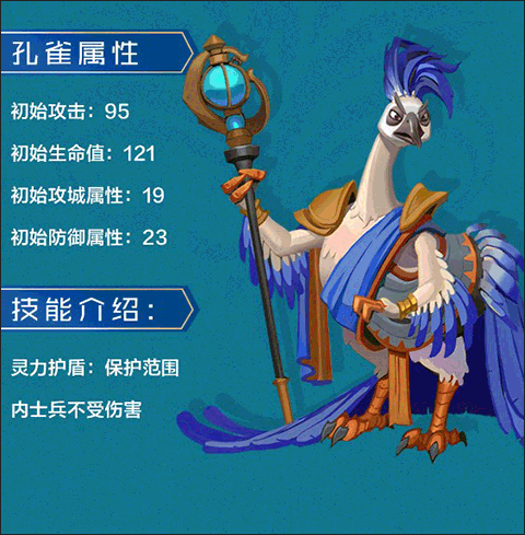 大家在游戏中指挥进攻炮台是不是都因为兵力损失的问题而感到苦恼,这个时候你需要一只孔雀法师来帮助你,孔雀法师在战场中可以给己方士兵提供护盾,保证小兵在范围内不受到伤害,是一位攻城利器,我们先看孔雀法师的角色属性吧。