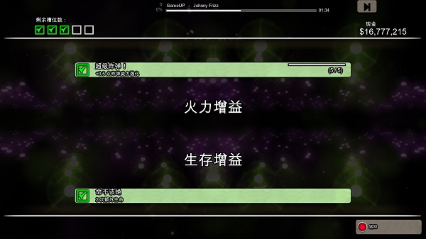 增益分为其他增益,分数增益,火力增益,生存增益,难度增益,增益最多同时携带五种