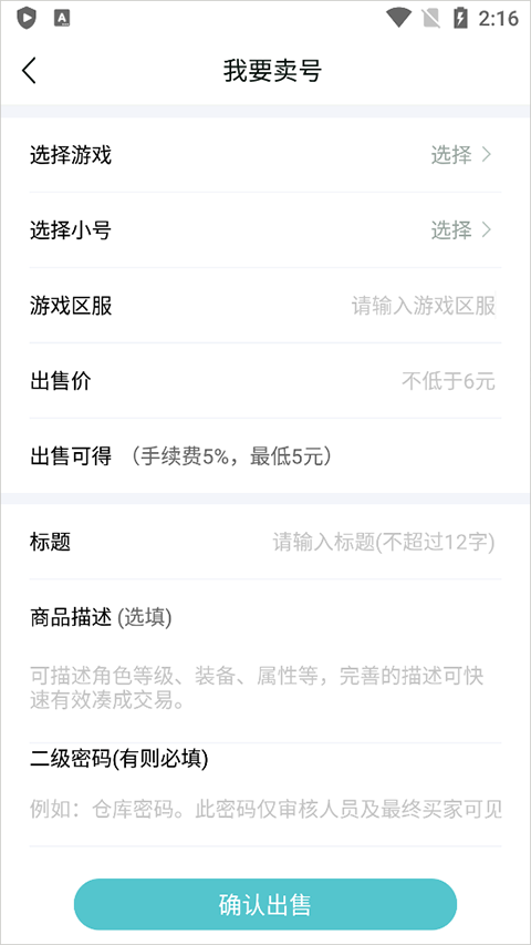 ④填写标题、描述、区服、价格,以及上传截图,为了顺利通过审核,标题和描述中请不要带有联系方式等,提交的截图也需要注意不要带有广告信息以及无关截图。