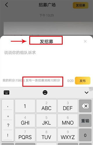 2、接着进行输入招募组队的要求是,需要消耗积分后,才可以发布。