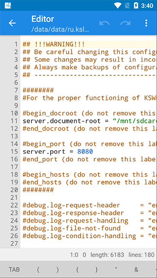 你想拥有在任何方便的地方运行在PHP网站上的平台?这是可能的!这足以在Android设备上安装KSWEB和脚本复制到htdocs文件夹中存储卡上。在这之后,你可以运行你的网页内容!所以,KSWEB是Web开发者为Android平台的一组。该软件包包括:Web服务器,FTP服务器,PHP编程语言,MySQL的数据库管理系统和调度。 KSWEB并不需要root权限正常运作,除非,当然,你要使用的服务器上的端口80。顺便说一句,它可以在互联网上打开你的服务器时很方便。这将让你有一个小的托管在你的口袋!功能列表