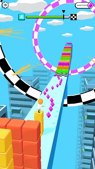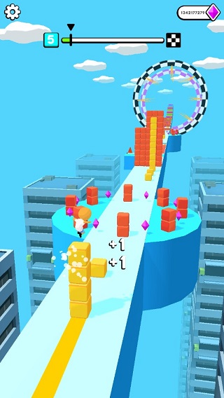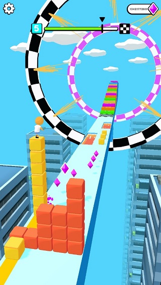 游戏中,玩家在一条道路上进行冲浪,而你控制的一个小人脚下踩着一个方块前进,在前进的道路上有着很多的障碍,只有获得更多道路上的方块,然后提升你的高度之后才能通过沿路的障碍,玩法就是这么的新颖还有具有趣味性。操作的方法很简单,只需要一个手指左右滑动就可以了,但是带来的乐趣是非常巨大的,获得的沿路方块越来越多你就会变得更加的高,并且是没有限制的变高。