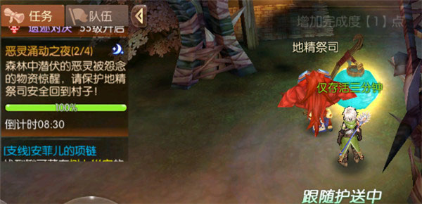 日阳森林的怨灵闻到物资蕴含的怨念气息,前来阻碍祭司护送物资。在这一阶段,玩家将护送地精祭司安全返回村子。在护送过程中,需要击败怨灵,当击杀数达到一定程度,或阶段倒计时结束,本阶段结束,发放阶段结算奖励,事件进入下一阶段。
