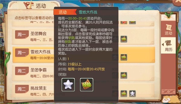 -玩法分为三层,每隔一段时间场景中会刷出雪球,点击雪球完成读条吟唱,可获得声望和钥匙。每层结束时拥有钥匙者才可以进入下一层,被击杀后身上钥匙会掉落。进入新的一层可以得到大量声望。有一定难度。