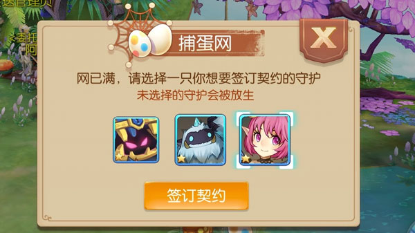 当背包里存有捕捉网时,只需要靠近想要捕捉的守护蛋即可,每张捕捉网可以捉三只宝宝,点击可以查看每只的详细属性,选择一只最心仪的签订契约,宝宝就到碗里来啦~