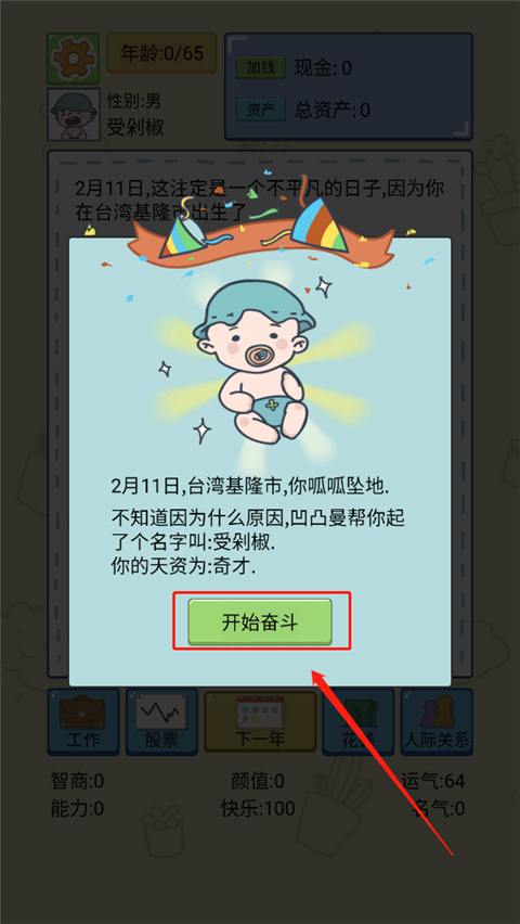 2、这个时候你刚刚出生,点击“开始奋斗”。