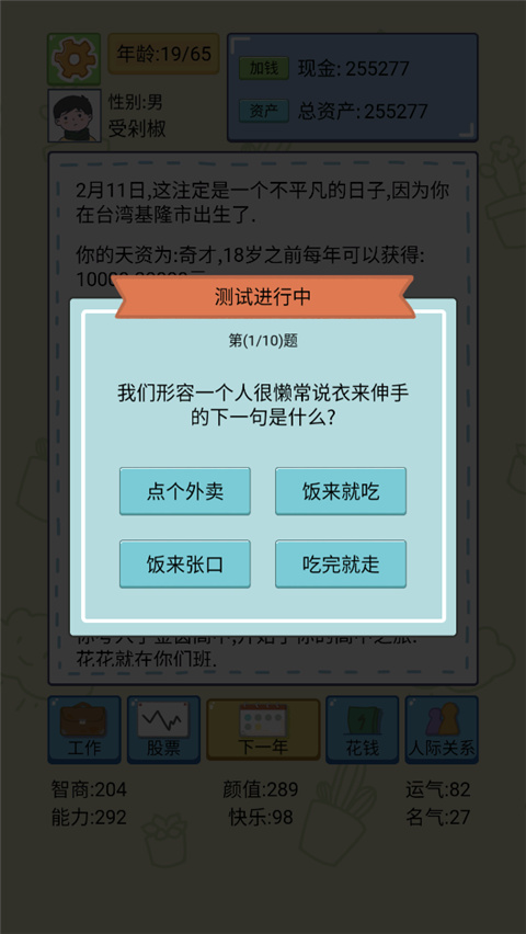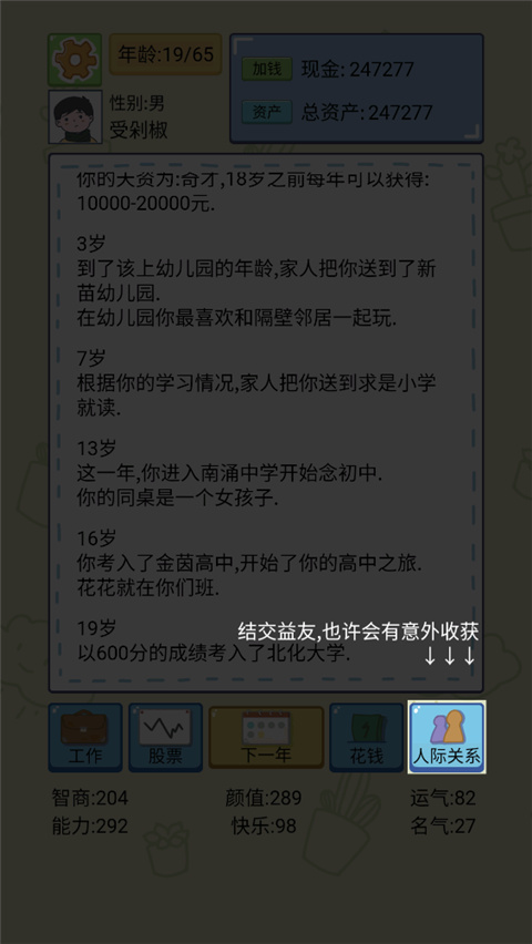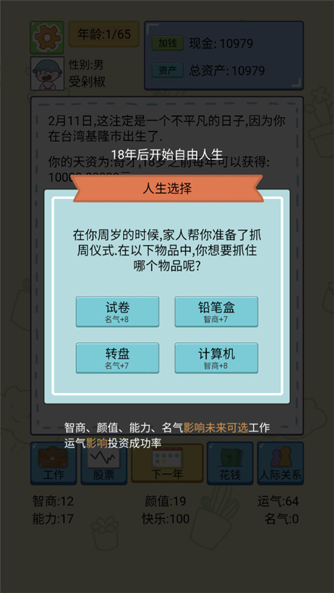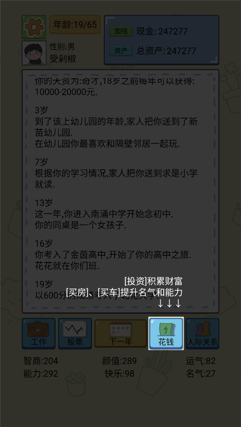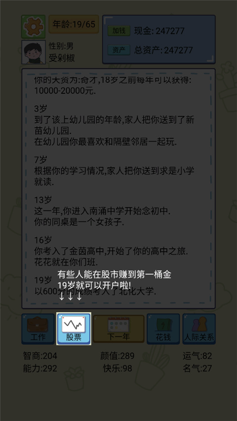 3、这个时候就会开始自己人生的第一次的选择,里面的智商、颜值、能力以及名气都是会影响未来可选工作运气以及影响投资成功率。