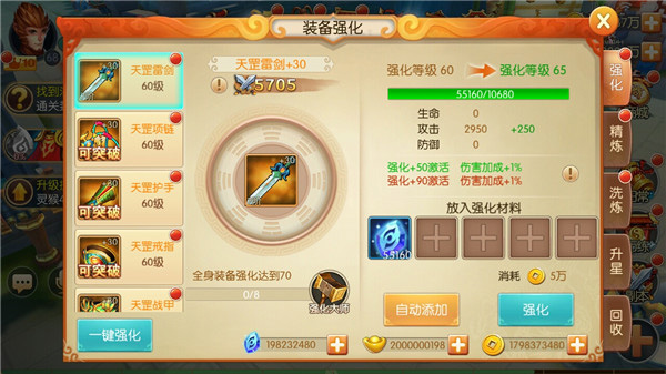 装备强化:装备具有攻击,防御,生命这3类属性,通过装备强化可以提升这些属性。装备强化是通过放入强化材料和消耗铜币来强化装备,强化材料可以是低级装备(绿色和蓝色),也可以是装备强化石,以及铜币。装备强化等级上限为玩家当前等级的两倍,装备强化到一定等级需要突破,突破需要消耗万能突破丹。装备强化到一定等级可以获得额外的属性。