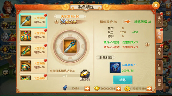 装备精炼:装备精炼可提升装备自身属性,装备精炼需要消耗装备精炼石,精炼到一定等级需要消耗装备自身,8件装备同时精炼到5的倍数可获得额外属性加成。