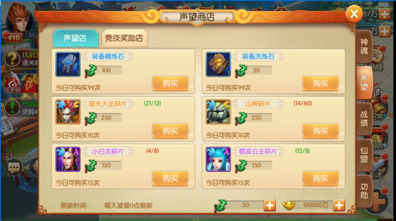 商店:声望商店买混天大圣,战绩商店换红孩儿,仙盟商店换地藏王,功勋商店买牛魔王,逐渐养成。