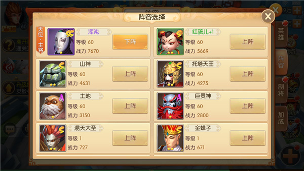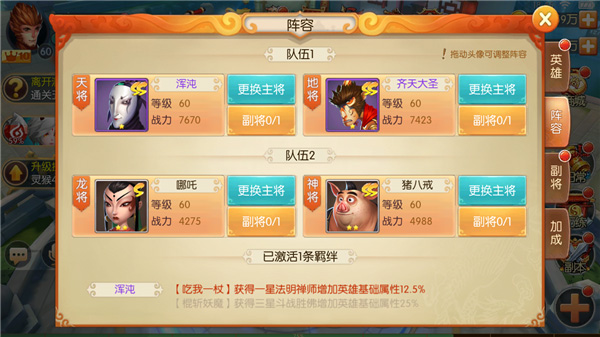 主将:上阵主将位置的英雄可以携带到战斗中,共计天、地、龙、神四个主将位,玩家可以在阵容界面随意调整位置。