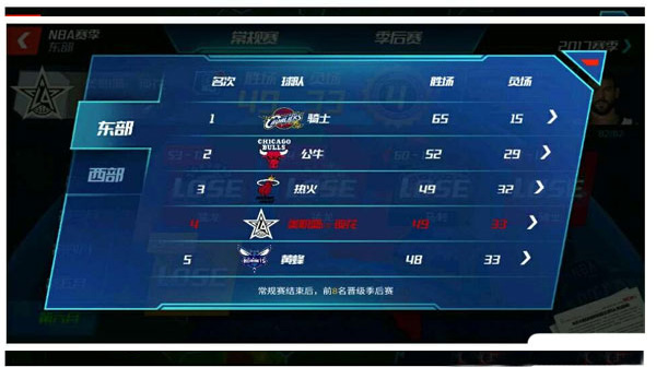 TIPS:由于常规赛结束后前八名可进入季后赛,所以若失误输掉了一盘,在不影响排名的前提下,可以忽略过去。但如果影响到前八的排名,小编建议最好还是重新挑战吧。