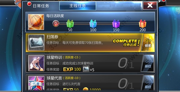 《NBA范特西》中玩家如何利用有限的体力来尽可能获得更多的经验是大多数玩家比较头疼的问题,要知道我们在每场比赛当中最多只能够获得6点的经验值,而每升一级所需要的几百经验乃至后期上千的经验应该去哪里赚呢?没错!每日任务!很多玩家在一开始进入游戏时往往会忽略任务而直接投入到比赛当中,导致后期没有足够的体力来完成每日任务来获取经验,而如果我们一开始就跟着任务来过关相应的比赛,不仅能够更快地达到升级目的而且还能够更多了解游戏内每一个功能的正确使用方式。