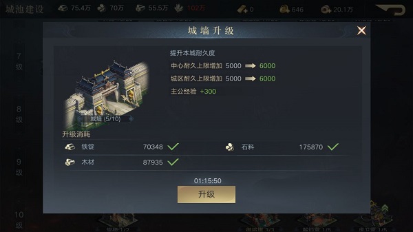 在主城或者分城的城建功能中,找到城墙,对城墙进行升级,可以极大提高城墙的耐久程度。当然,这个方法只适合在自己的主城或者分城上进行使用,也需要未雨绸缪提前就要进行升级。