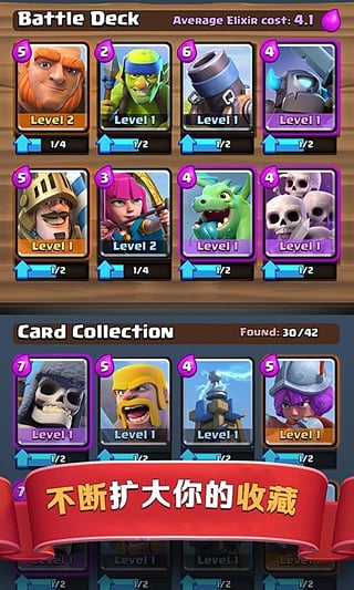 收集皇室战争家族成员和您熟悉的《部落冲突》军队,法术和防御建筑等卡牌,打造和升级您的卡组。