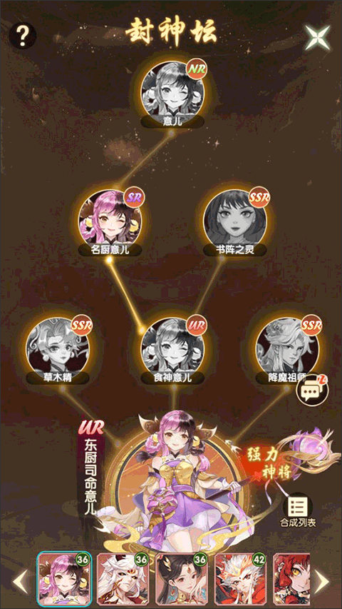 在游戏中共分为3类伙伴:仙、魔、凡,其中伙伴还分为了很多品质:N、NR、R、SR、SSR、UR。除了UR之外,品质越高,角色的资质也就越好,其他品质的角色都可以通过招募来获取,但UR就不一样了,这个品质的角色都是非常强力的存在,但这些角色都是通过培养一些低品质的指定角色来一步步慢慢提升的,等指定的伙伴集齐后就可以合成了,小编可以给大家推荐一个萌新优先合成的角色,就是我们新手送的意儿,大家可别小看他哦,他可是前期最好升级为UR的角色,而且上限也非常高,后期还可以通过封神坛提升成神将东厨司命意儿,非常强力。