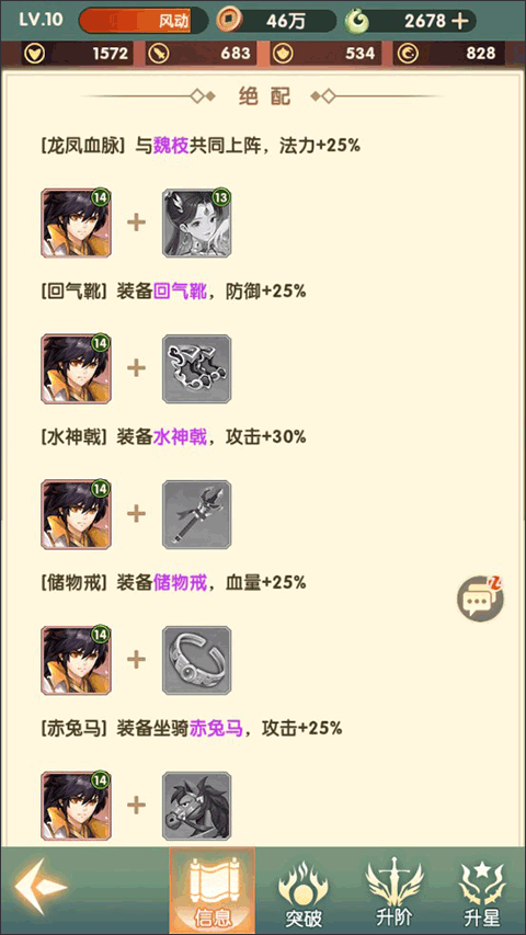 在刚进游戏后,我们大家是了解到我们主角是拥有万中无一的神龙血脉,而我们帮助过的魏枝小姐姐是凤凰血脉,这种羁绊就可以让他们成为最佳拍档,2人共同上阵就获得属性的加成。当然除了角色之外,角色如果使用趁手的武器装备也可以获得额外的属性加成,正如小编图上所示。所以大家最好是根据自己的角色搭配为案本,来进行配队,这样就可以起到事半功倍的效果了。