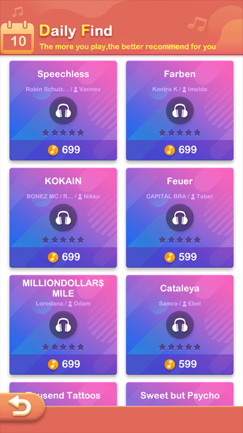 3、点击主页的“daily find”可以看到游戏根据你平时弹奏的歌曲个性化推荐的同类型歌曲。