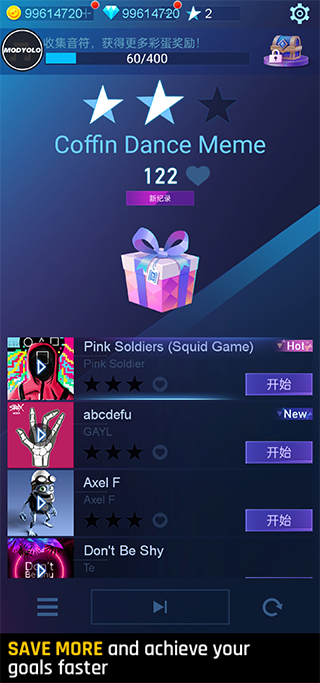 2、选择你喜欢的音乐点击进入游戏,每个音乐节奏都有所不同,难度也有所不同;