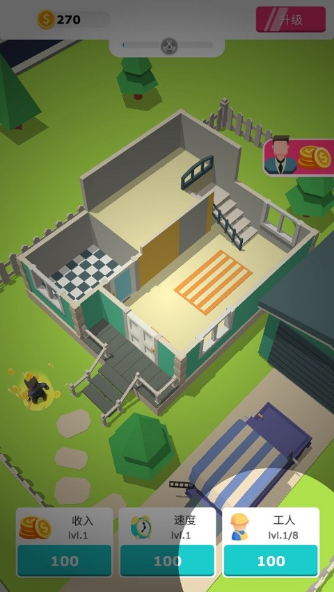 只要开始游戏就会源源不断获得收益,通过增加工人的数量,升级速度,加速房屋以及装饰的工作效率!