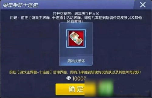 活动内容:活动期间,每日可前往商城购买1次【周年庆手环】大礼包,前往十连抽界面打开后有机会活动永久皮肤、传奇碎片。