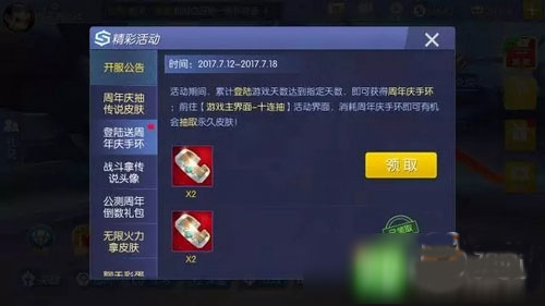 活动内容:活动期间内,累积登陆天数达到指定天数即可获得周年庆手环,前往活动界面可以抽取到传奇碎片