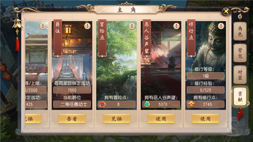 点击任务头像选择贡献栏,拖到最后就看到你的修行点数了,三场地狱刷满就是2745点,有了修行点数就可以摇修行了,方法就是点击使用,进入下一个界面。