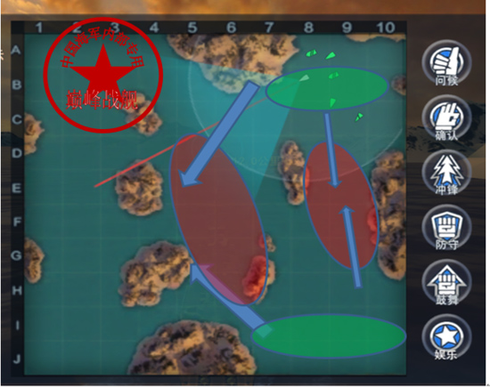 死斗模式没有据点,所以不推荐往据点方向跑,驱逐舰可根据蓝色箭头方向前进,利用地图中间岛屿掩护。战列舰在战局不明朗的情况下不推荐冒进。地图较小,不是很推荐抱成一团。