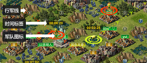显示该支军队到达的倒计时时间。时间标签上的文字颜色显示了该军队与玩家自己的关系,与旗号颜色一致