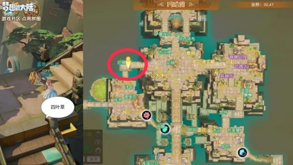 奇遇这是爱情的形状:玛哈雅坐标32.47,天气为下雨时,捡起地上“发光的四叶草”触发,具体位置如下图: