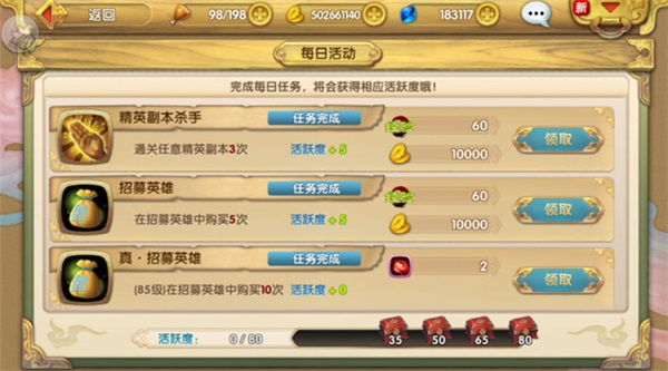 然后就是购买类的任务,金币体力,轻轻一点即可,招募英雄,我们每天完成所有任务后,系统会送几个英雄令,加上每天免费的次数,使用五次也是毫不费劲的。