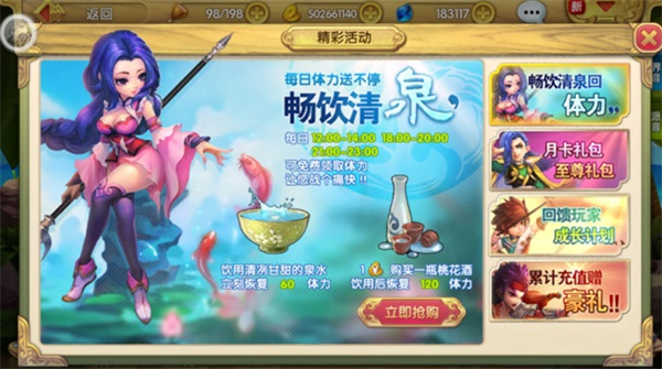 大家常见的,就是体力的自然增长。其次,体力还可以通过精彩活动中免费领取。每天可以领取三次,共计180体力。另外每天也可以花1块钱购买120体力。价格非常实惠,建议购买。