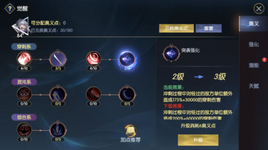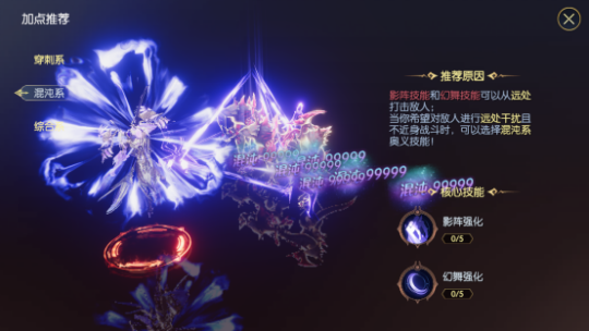 觉醒加点:混沌系加点,优先点出“影阵强化”,其次点出“幻舞强化”。潜能优先加在混沌潜能上,其次分配给综合潜能。天赋主修星耀斗士,强化影阵技能范围和攻击次数,有余力的可继续培养修罗战将天赋,强化幻舞技能。