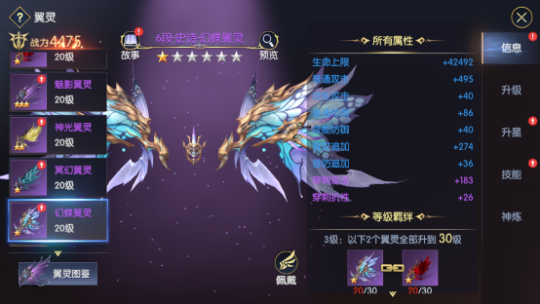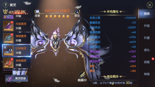 翼灵选择:初期选择精良品质的【华羽翼灵】,史诗品质的推荐【魅影翼灵】、【冥幻翼灵】或【幻蝶翼灵】,后期以传说品质的【钛金翼灵】为追求目标,大后期可追求绝世的【粼光翼灵】,这几个翼灵都以普攻、穿刺为主要加成属性,适合普攻流派。