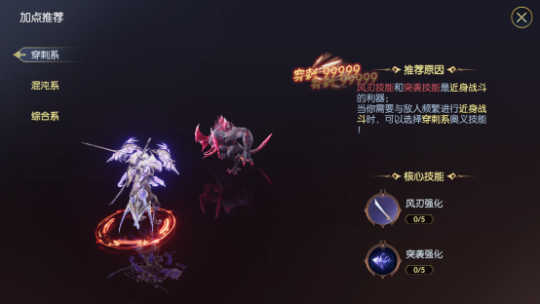 觉醒加点:优先点出穿刺系的“风刃强化”“突袭强化”2个技能。潜能全部加在穿刺潜能上,有剩下的可以分配给混沌潜能一部分。天赋优先养成疾风猎手,点出普攻召唤飓风的特效,其次再养成幻影游侠,加强攻击范围。