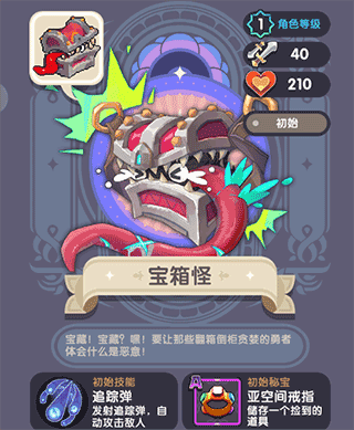 英雄评价:趣味型英雄,初始秘宝可多获取一个道具位。该道具为位为空时,宝箱怪拾取到的回血爱心,磁石,无敌星星不会再立刻生消耗,而是可以储存在右侧道具栏位中,在需要的时间再开启。由于这一特性,宝箱怪的技能搭配上就更为随意,更方便在生存压力不大的通关图内进行一些骚操作或者尝试新技能组合。