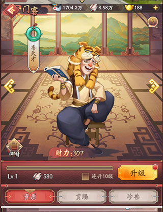 小橘子推荐一个前期培养的门客-韦天才,首先他获取容易,游戏第二天就能赠送韦天才,此外,在游戏第三天系统赠送韦天才的专属珍兽八卦鬼。这一门客虽然资质不高,但是财力成长惊人,属于游戏中佼佼者,特别是戏园收益达到十二倍,前期可大幅提升戏园收益。