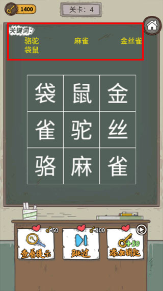 3、把全部关键词完成就能通过关卡。