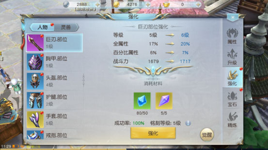 在第一个升级中,能够让装备进行升级之后获得不菲的战力和属性提升,则这个的装备部位强化是对整个部位进行全方面的提升,从部位的等级到全属性再到百分比属性以及战斗力都会进行火箭式的提升。而且从花费来看,都是花费一些较为常见的消耗材料而已。