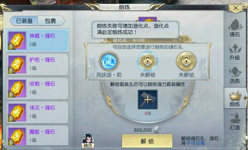 右上角可以选择黄色和紫色品质,每次打造消耗同品质同号三个魂石,黄色和紫色魂石均有几率出现套装属性,加五彩石几率会提高,属性也会提高30%,相当于一个槽位等级,一到五号只能出现初级套装属性,六到十号可以出现中级和初级套装属性,十一到十六号能出现初级中级高级所有的套装属性,而且十一号到十六号几率出现绿字,技能槽位伤害加成,分普攻(兵门),龙门,幻门,奇门,心门,绿字只对伤害技能有提升,不会增加槽位所带属性,建议打造黄石头不加五彩石,打造紫色魂石的时候都加上五彩石,这样出好属性的价格也会提升许多。