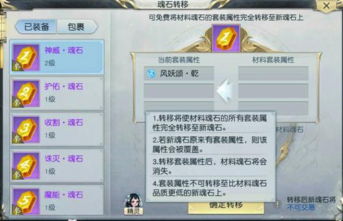 1、魂石转移一般就是把需要的套装属性转移到魂石胚子上,有几个限制,仅支持同号转同号,支持黄转黄,黄转紫,紫转紫,不支持紫转黄,转移不会改变胚子的属性,转移后原有的魂石将消失,得不到任何补偿。