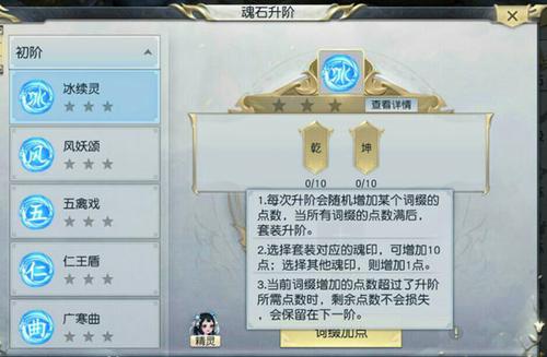 升阶冰续灵套装使用冰续灵魂印会增加随机十点,如果用其他的魂印,比如广寒曲,五禽戏魂印只会增加一点,不知道后面升阶消耗多少,应该会是翻倍增加。