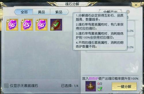 没有套装的普通魂石分解只有五彩石,低号和高号分解的五彩石数量不同,有套装的魂石直接分解有10%的几率分解出魂石自带的魂印,加熔炼炉分解几率提升到100%;一个熔炼炉需要五十个五彩石买。不同品质的套装分解需要的熔炼炉数量也不同,初级套装只需要一个炉子,中级的需要两个,高级的应该三个或四个,因为我没有高级套装魂石,蒙的。