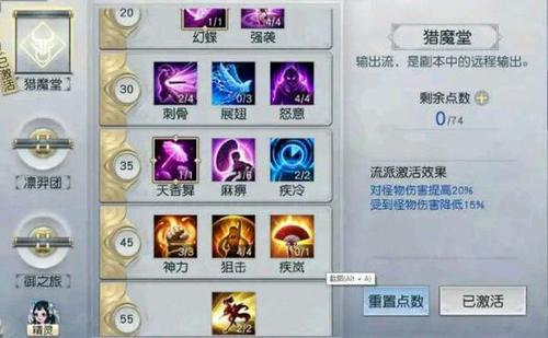 流派介绍之【猎魔堂】解析:猎魔堂的定义是副本输出,从它的流派效果就能看出来"对怪物伤害提高20%,受到怪物伤害降低15%",此流派适合前期使用,因角色前期伤害不高,及较为脆弱的同时,此流派能让你的副本生存能力更强,不容易阵亡,下面让我们看看它的大致加点吧!