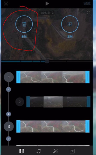 在一段素材上长按可以删除该段素材,也可以移动素材的位置。每段素材左右两端往中间拖动,可以剪掉两边多余的部分,只使用中间部分。
