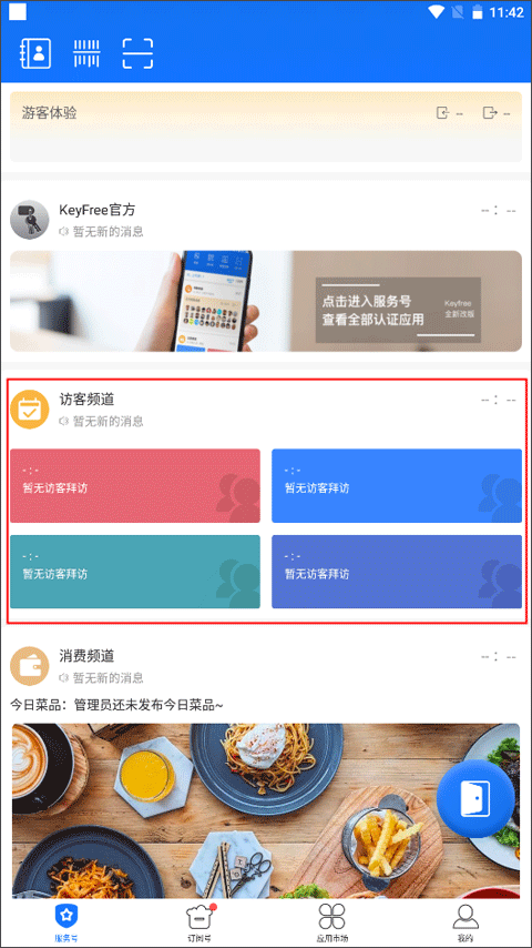 1、进入软件【服务号】,你会看到有很多的频道,如考勤频道、访客频道、消费频道等,点击进入到考勤频道中;